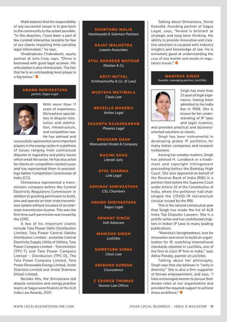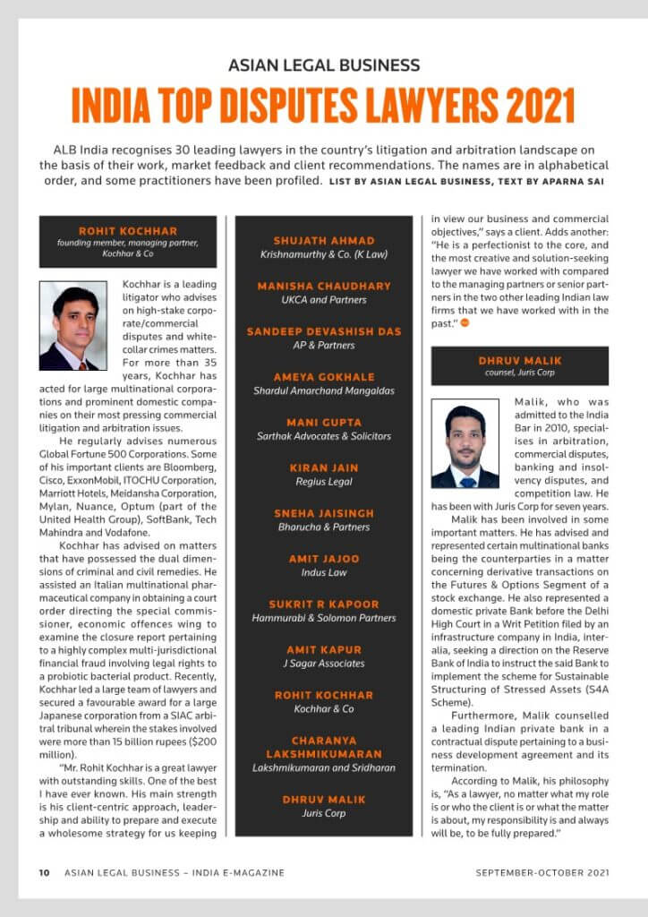 Abhinav Shrivastava Recognised Amongst India’s Top Disputes Lawyers 2021 by Asian Legal Business, a Thomson Reuters publication